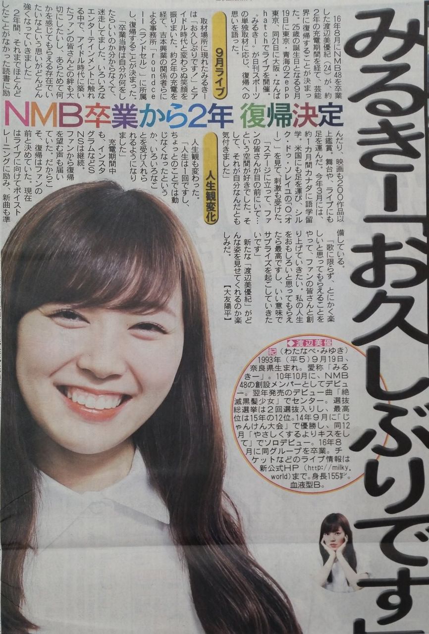 【朗報】元NMB48みるきーが2年ぶり芸能界復帰決定キタ━━━━(゚∀゚)━━━━!!【渡辺美優紀】