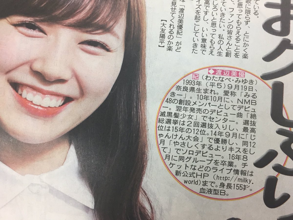 ◆渡辺美優紀(わたなべ・みゆき)1993年(平5)9月19日、奈良県生まれ。愛称「みるきー」。