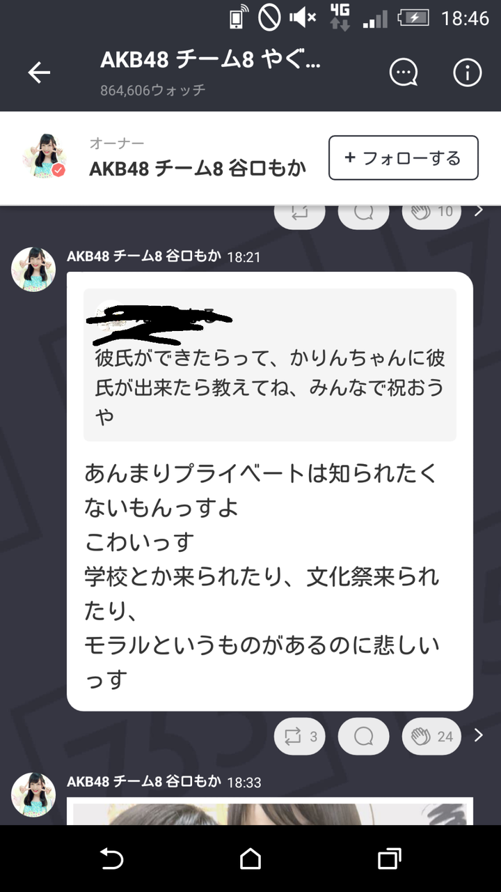 【チーム8】谷口もか「プライベートは知られたくない。こわい。学校とか文化祭に来られたり、モラルというものがあるのに悲しい。」【それはそう】