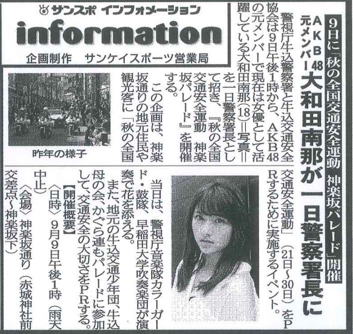 【牛込警察署】9月9日(日)、秋の全国交通安全運動に伴う「神楽坂パレード」に一日警察署長として予定されていた大和田南那さんですが、参加することができなくなりました。