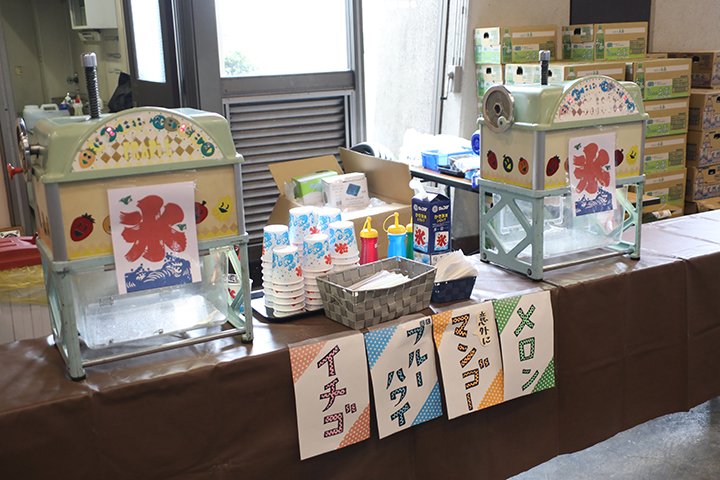暑さ対策でかき氷提供(セルフです)、ドリンクの無料配布、ガリガリ君無料配布コーナーが場内に用意されています。