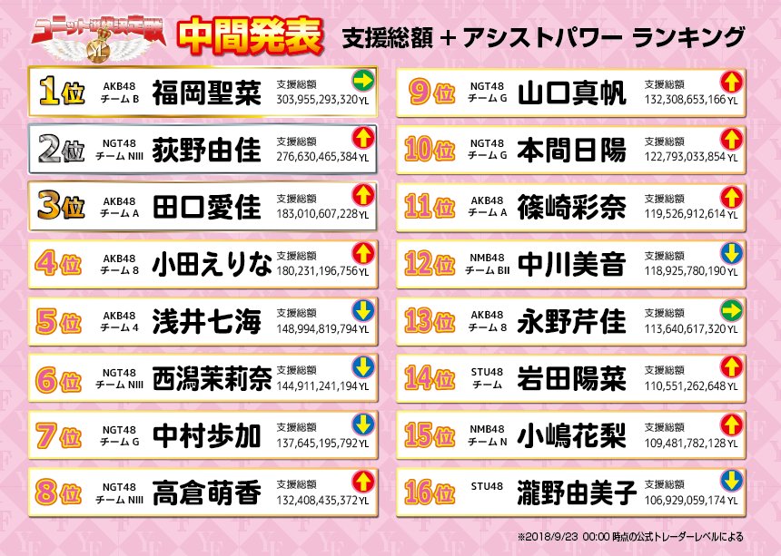 9/22(土) 24時点でのAiKaBuユニット選抜決定戦YFの1位~16位のランキングと