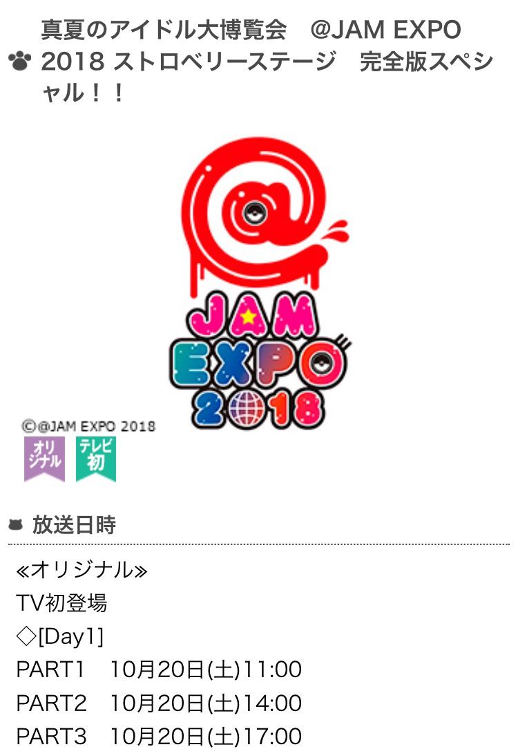 横浜アリーナで開催された、真夏のアイドル大博覧会“@JAM EXPO 2018”のメインステージ“ストロベリーステージ”でのライブの模様を18時間スペシャル特番としてオンエア!DAY1の模様をPART1・PART2・PART3に、DAY2の模様をPART1・PART2・PART3に!これらを一挙まとめて放送!!