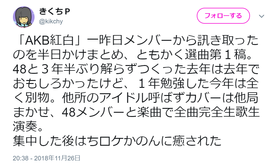 「AKB紅白」一昨日メンバーから訊き取ったのを半日かけまとめ、ともかく選曲第1稿。