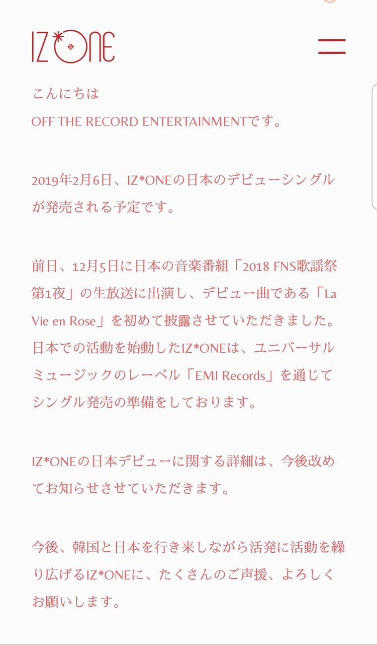 前日、12月5日に日本の音楽番組「2018 FNS歌謡祭第1夜」の生放送に出演し、デビュー曲である「La Vie en Rose」を初めて披露させていただきました。 日本での活動を始動したIZ*ONEは、ユニバーサルミュージックのレーベル「EMI Records」を通じてアルバム発売の準備をしております。