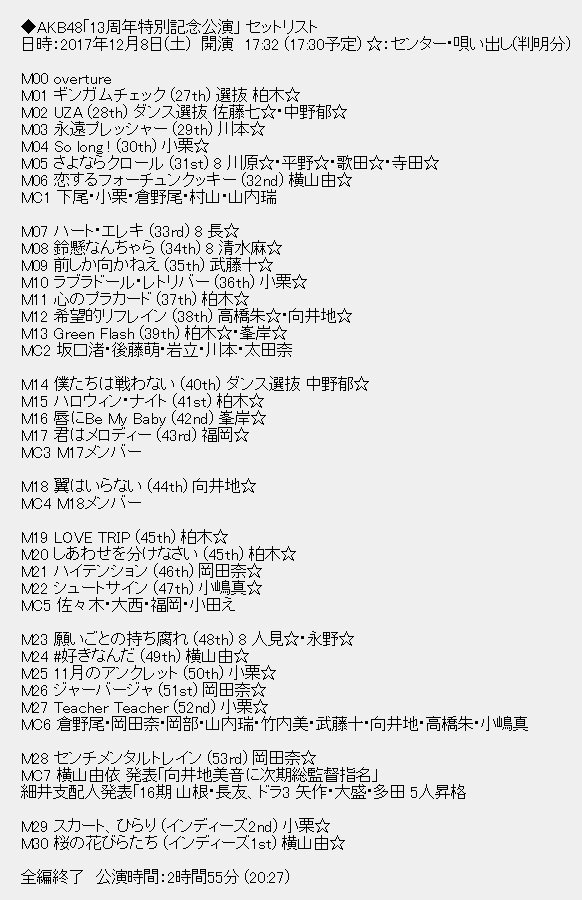 日時:2017年12月8日(土) 開演 17:32 (17:30予定) ☆:センター・唄い出し(判明分)