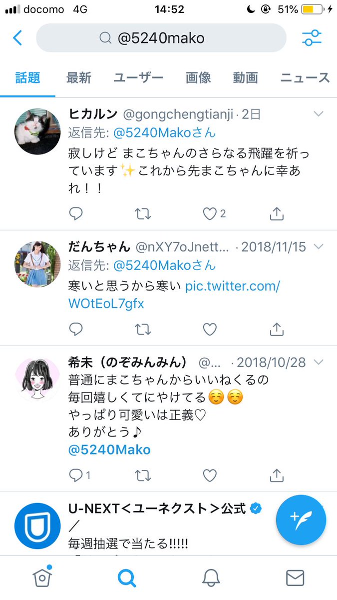 5240makoの方は鍵垢だからツイートは見られないけど残ってるリプを見る感じライブ配信とかは結構やってたみたいだね。アイコン見る感じ大橋真子ちゃん本人かな?