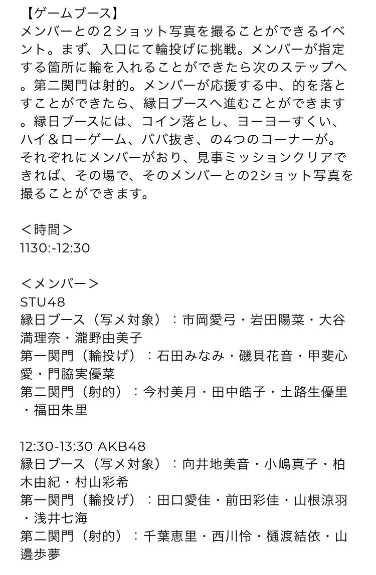 注目は、ゲームにクリアするとメンバーと2ショット写真を撮ることができるゲームブース!メンバーに応援されながら頑張る第一関門の「輪投げ」、第二関門の「射的」にクリアすると第三関門「コイン落とし」「ヨーヨーすくい」「ハイ&ローゲーム」「ババ抜き」の4つのコーナーがございます。見事クリア出来たらそのコーナーにいるメンバーと2ショットを撮ることができます♪