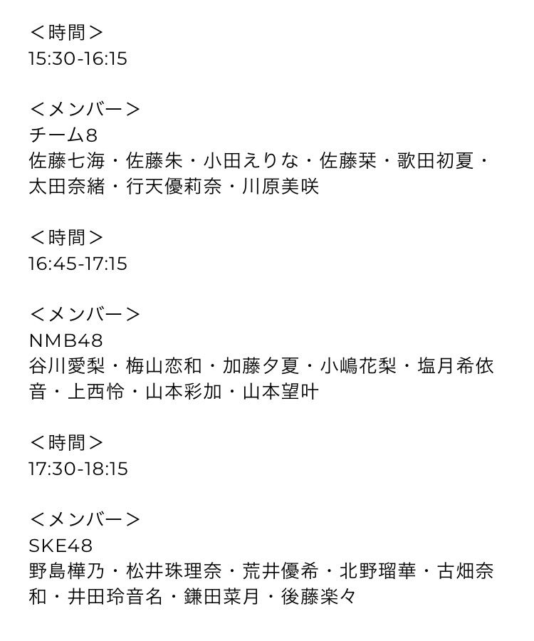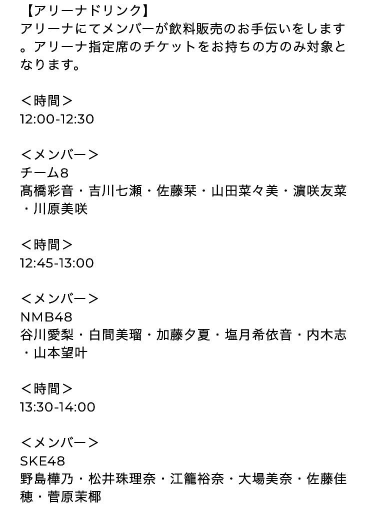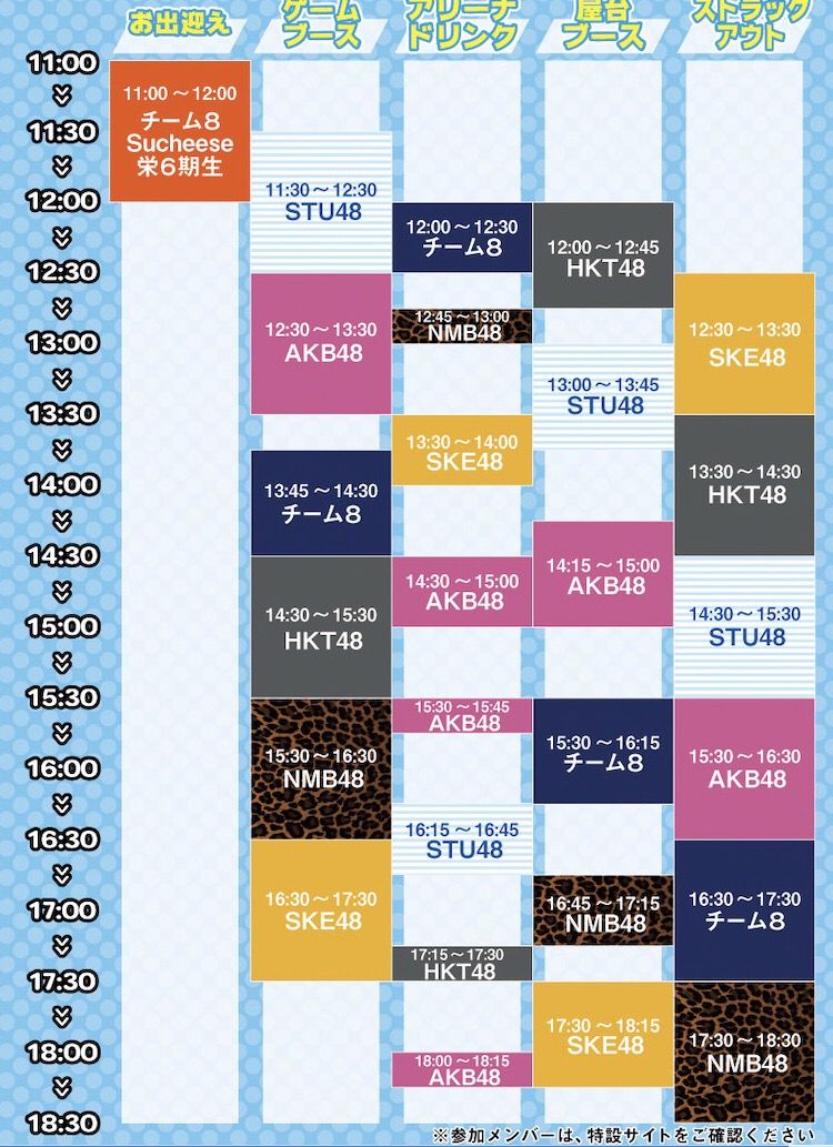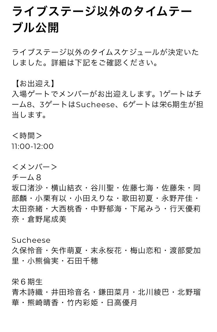 さらに、メンバーによるお出迎えも決定!!11:00~12:00の間にてチーム8は1ゲート、Sucheeseは3ゲート、栄6期生は6ゲートを担当します。