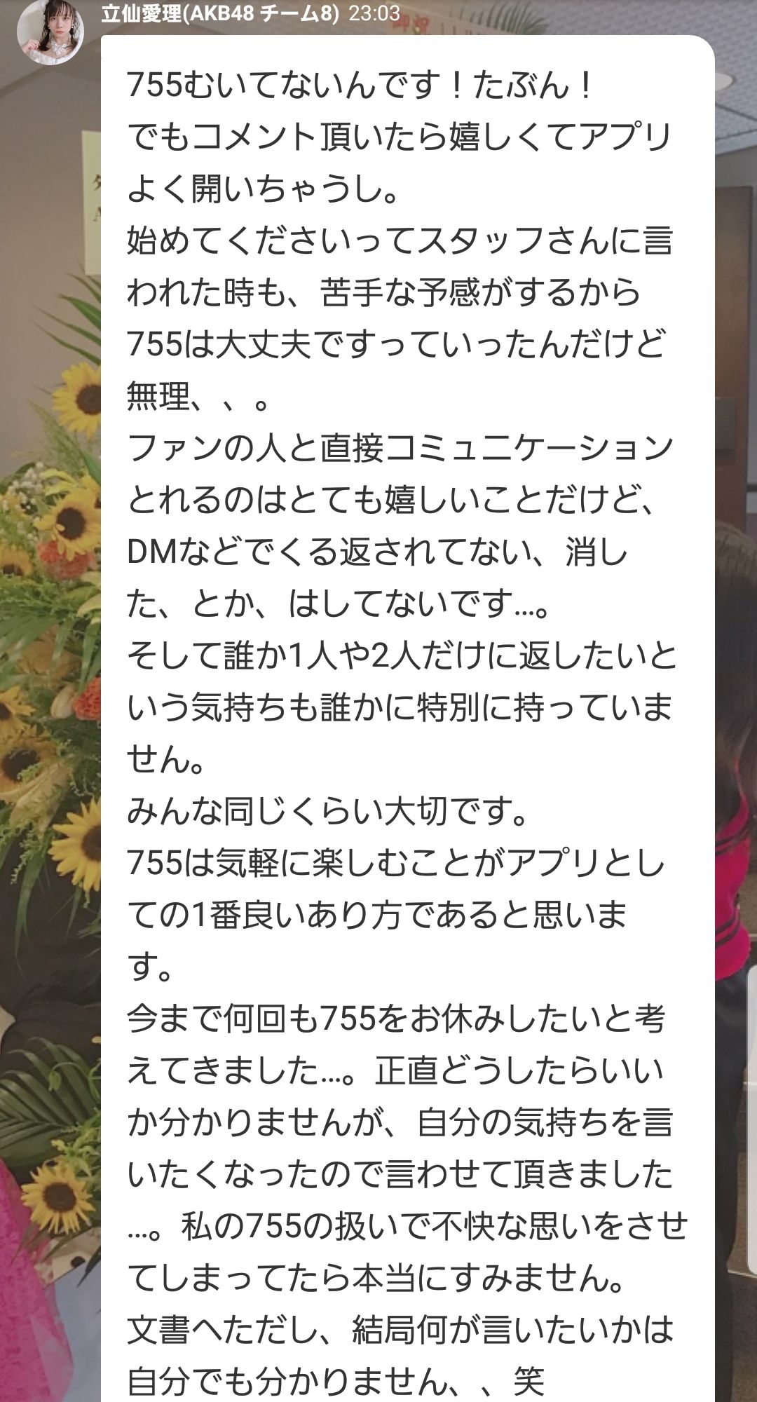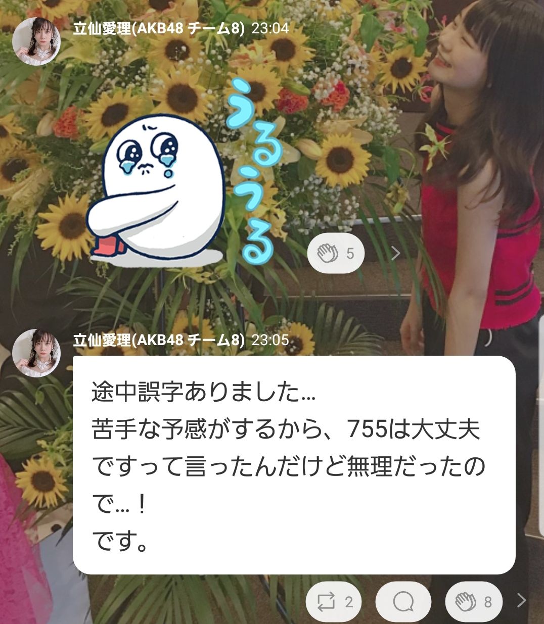 チーム8立仙愛理「755やりたくないって言ったのにスタッフに始めろって言われた。でもやっぱ無理。」