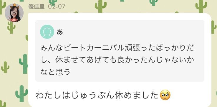みんなビートカーニバル頑張ったばっかりだし、休ませてあげても良かったんじゃないかなと思う