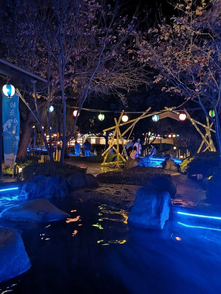 足湯の青い照明