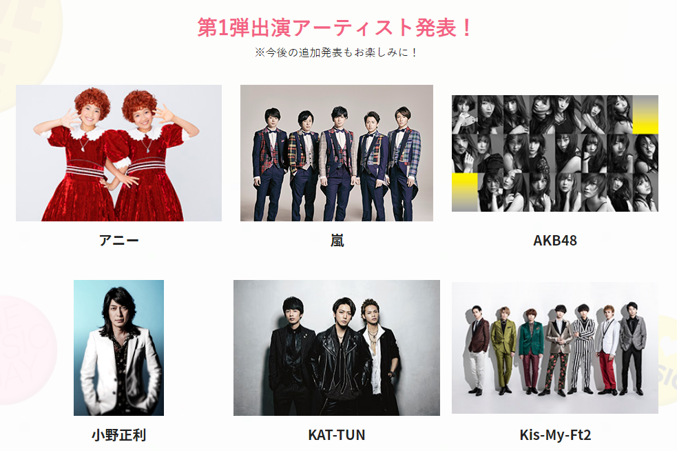 【朗報】 THE MUSIC DAY 第1弾出演アーティストに嵐・AKB48ら 1億再生メドレーで「ヘビロテ」、他複数曲披露!