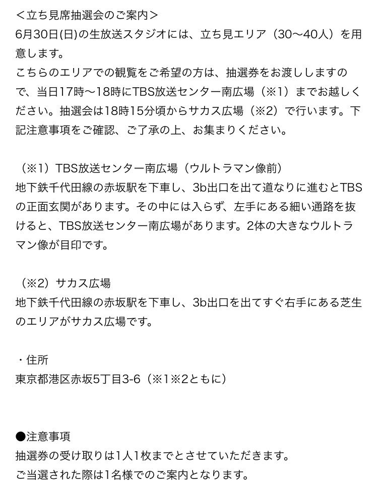 こちらのエリアでの観覧をご希望の方は、抽選券をお渡ししますので、当日17時~18時にTBS放送センター南広場(※1)までお越しください。抽選会は18時15分頃からサカス広場(※2)で行います。下記注意事項をご確認、ご了承の上、お集まりください。