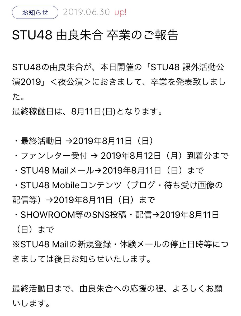 ・STU48 Mobileコンテンツ(ブログ・待ち受け画像の配信等)→2019年8月11日(日)まで