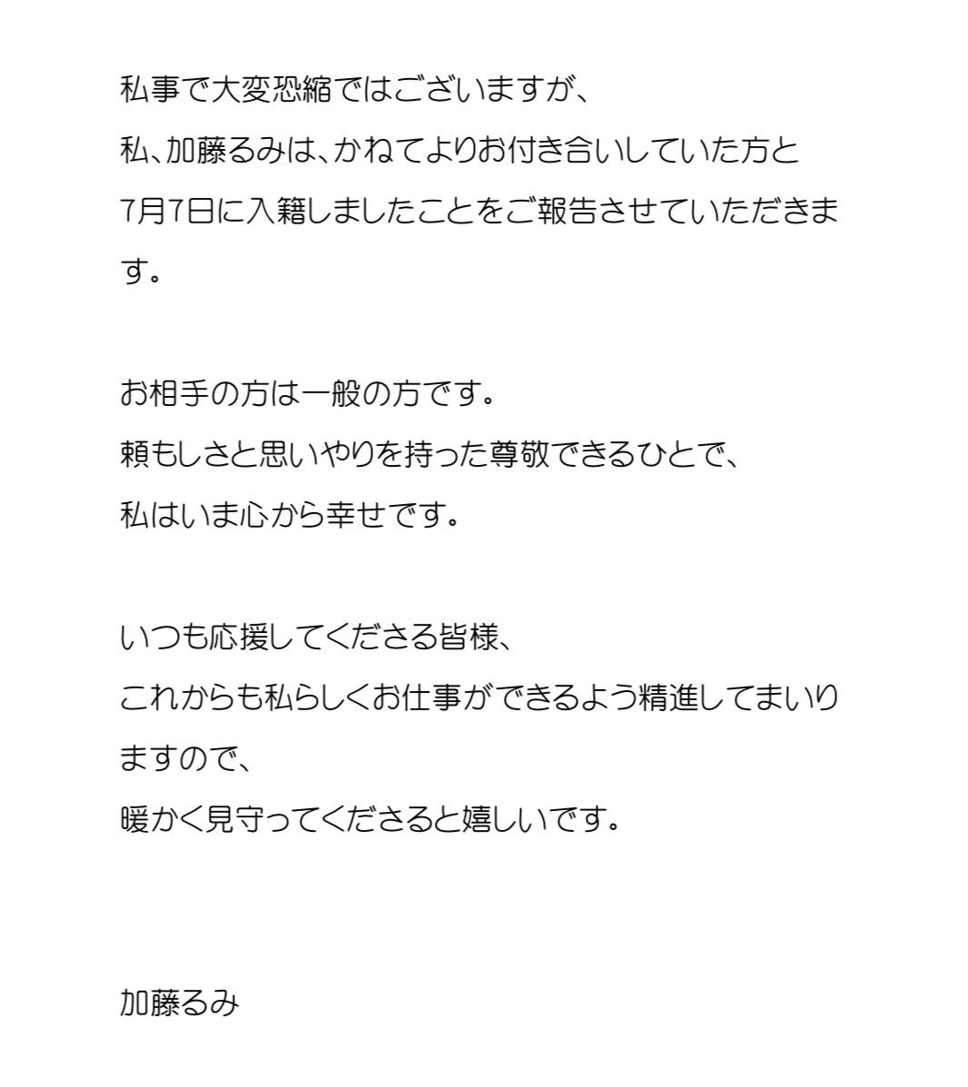 私事で大変恐縮ではございますが、 私、加藤るみは、かねてよりお付き合いしていた方と7月7日に入籍しま