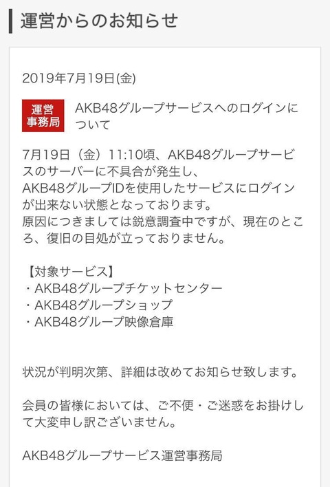 AKB48グループチケットセンターよりお知らせ