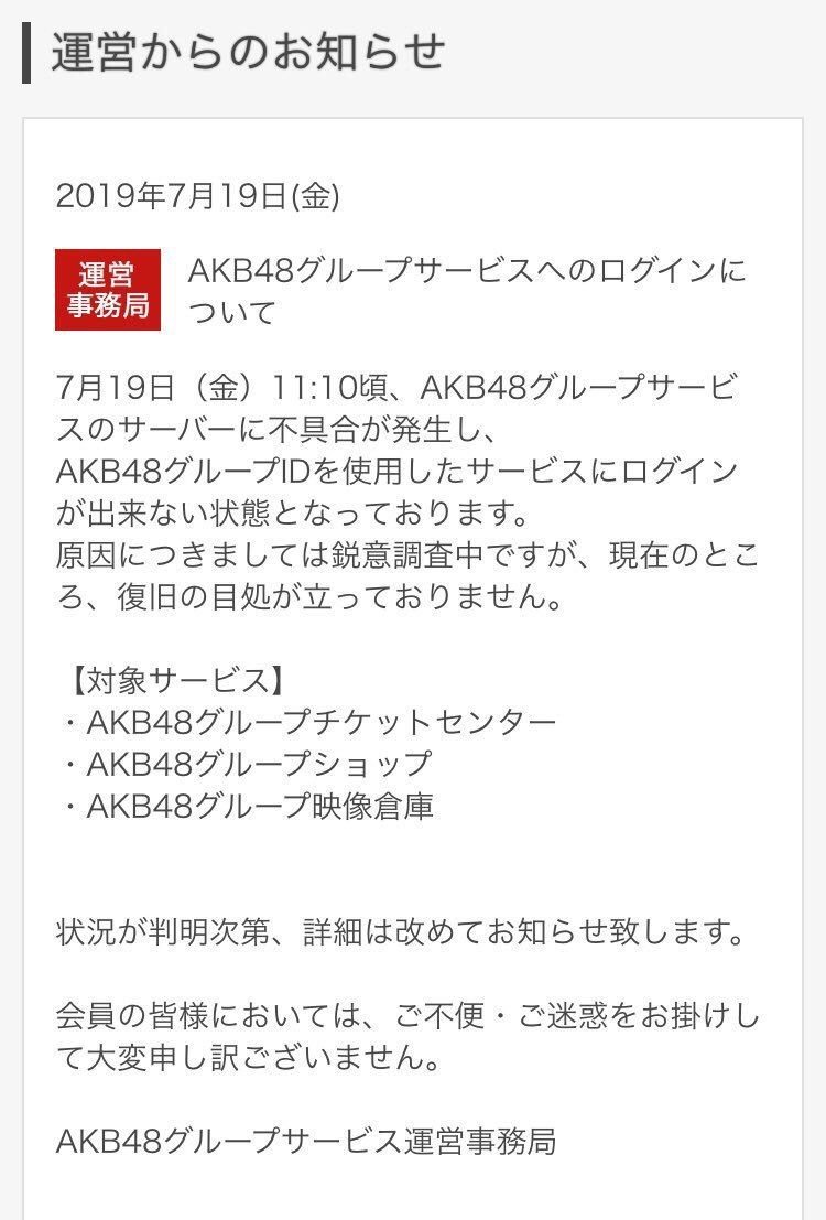 本日の11:10頃、AKB48グループサービスのサーバーに不具合が発生し、チケットセンターが利用できない状況となっております。