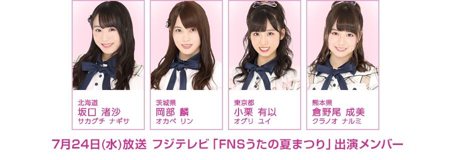 7月24日(水)放送フジテレビ「FNSうたの夏まつり」にAKB48チーム8 坂口渚沙、岡部麟、小栗有以、倉野尾成美が出演します! 当日は、AKB48の選抜メンバーとして、新曲『サステナブル』を初披露します! お楽しみに!!