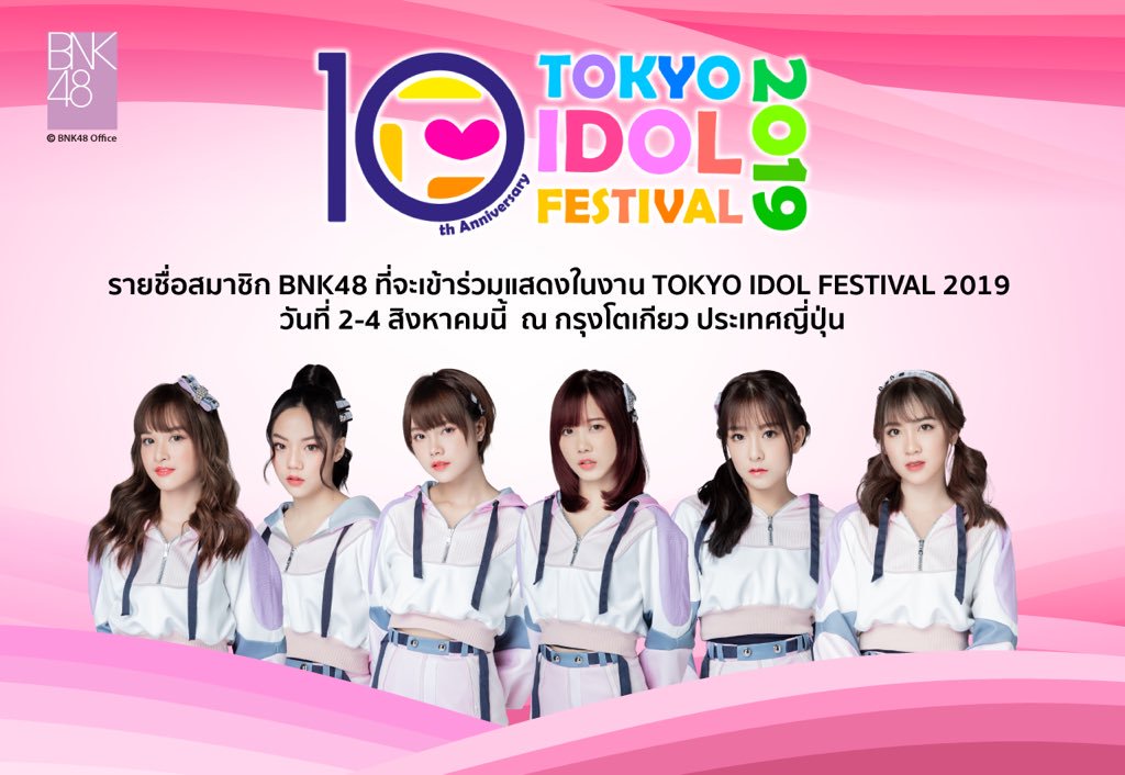 「TOKYO IDOL FESTIVAL 2019」にBNK48が出演します。出演メンバーはMusic、Pupe、Satchan、Mewnich、Bamboo、Newです。お楽しみに.