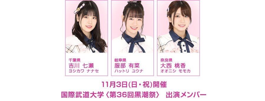 国際武道大学で開催される〈第36回黒潮祭〉に、AKB48チーム8 吉川七瀬、服部有菜、大西桃香の3名が出演し、ステージイベントを盛り上げます!