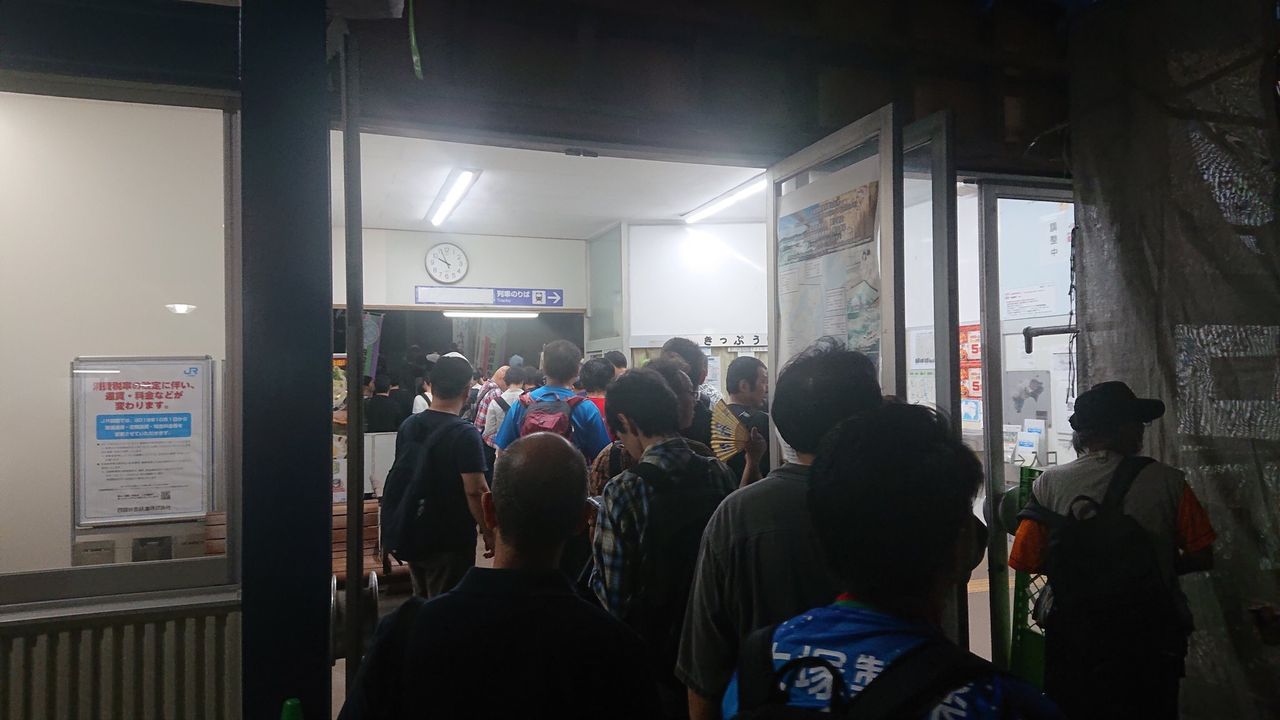 切符を買うという全時代的な行為のため駅の外まで行列している。そして駅員は誰もいない。