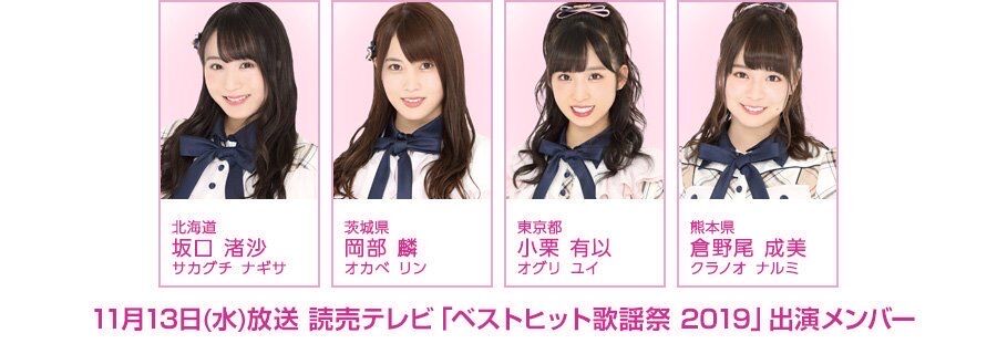 生放送の読売テレビ「ベストヒット歌謡祭 2019」に、チーム8から、坂口渚沙・岡部麟、小栗有以、倉野尾成美が出演します!