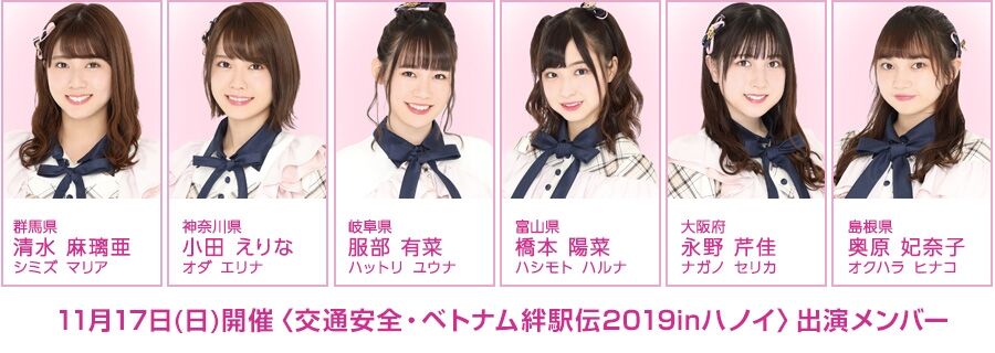 11月17日(日)にベトナム・ハノイのリータート-公園にて開催される〈交通安全・ベトナム絆駅伝2019inハノイ〉にAKB48チーム8の清水麻璃亜、小田えりな、服部有菜、橋本陽菜、永野芹佳、奥原妃奈子が出演いたします。