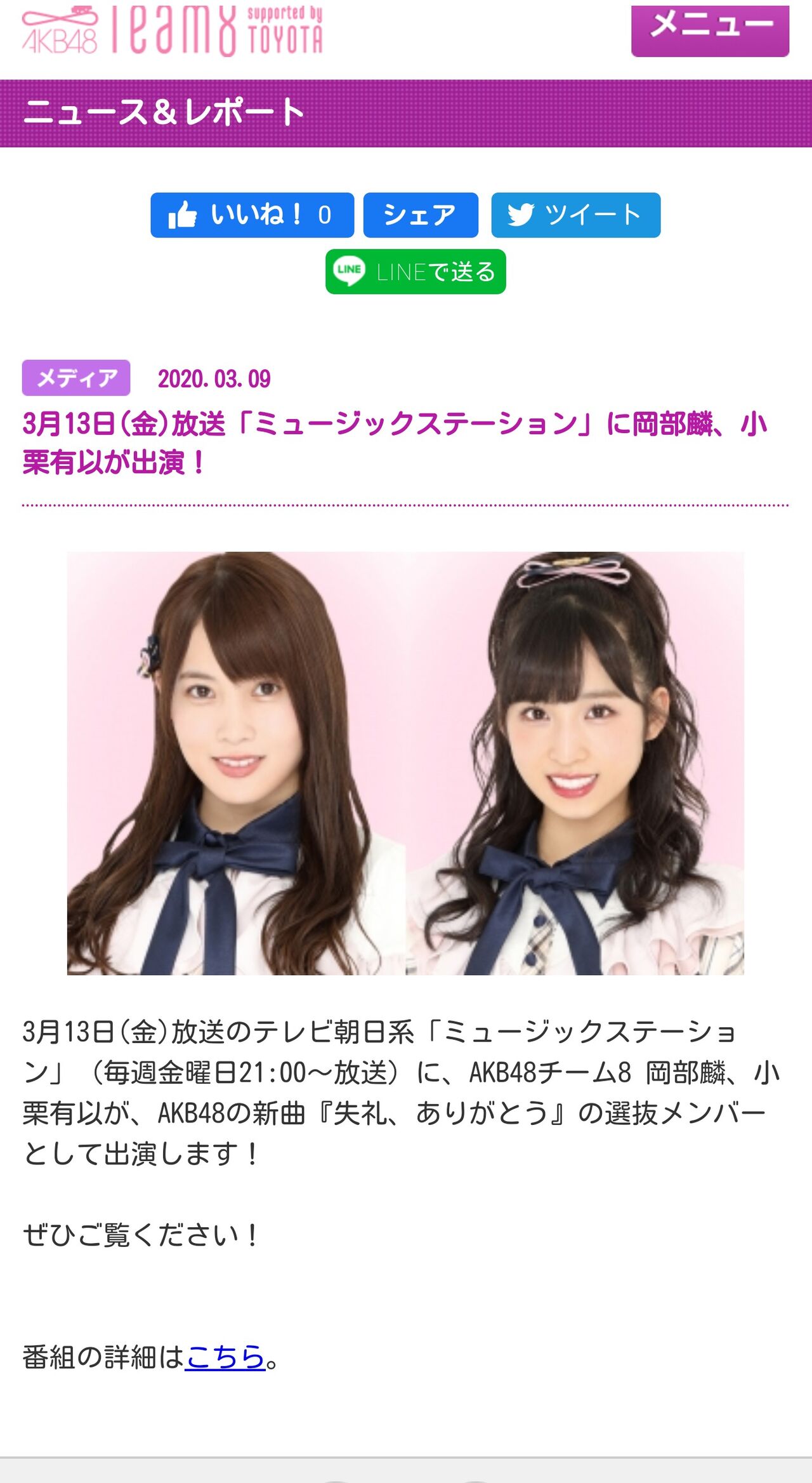 3月13日(金)放送のテレビ朝日系「ミュージックステーション」(毎週金曜日21:00~放送)に、AKB48チーム8 岡部麟、小栗有以が、AKB48の新曲『失礼、ありがとう』の選抜メンバーとして出演します!