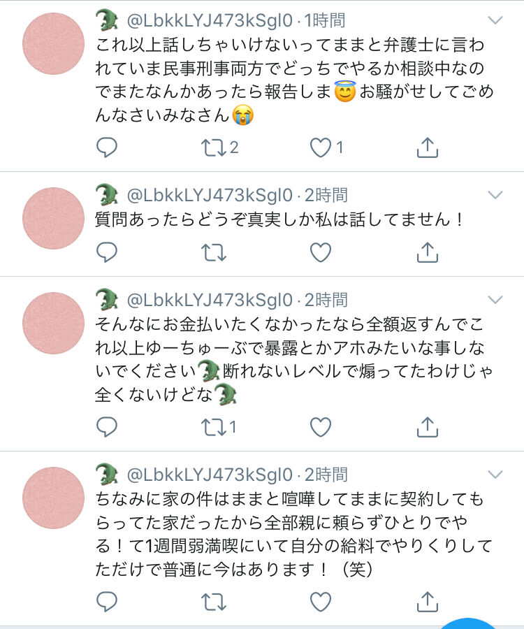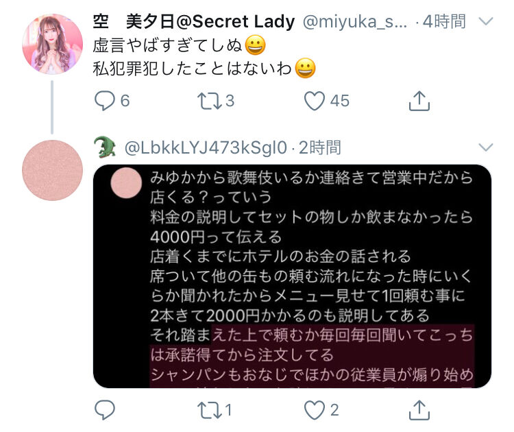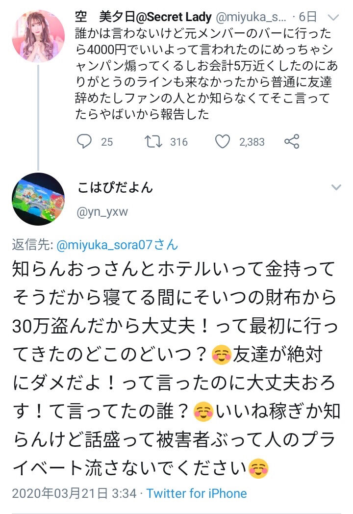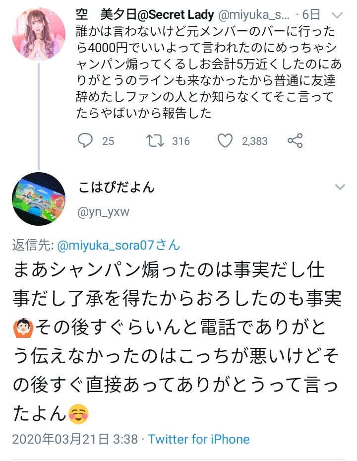 誰かは言わないけど元メンバーのバーに行ったら4000円でいいよって言われたのにめっちゃシャンパン煽ってくるしお会計5万近くしたのにありがとうのラインも来なかったから普通に友達辞めたしファンの人とか知らなくてそこ言ってたらやばいから報告した
