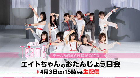 チーム8の結成6周年となる4月3日(金)の15時より、GYAO!にて『チーム8結成6周年記念特番!エイトちゃんのおたんじょう日会』が独占無料生配信※されることが決定しました!