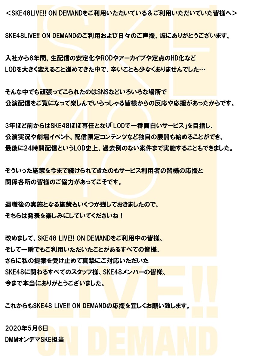 実はDMMオンデマSKE担当ですが5月8日をもって退職することが決まっておりまして、今回の24時間配信が最後の担当案件でした。