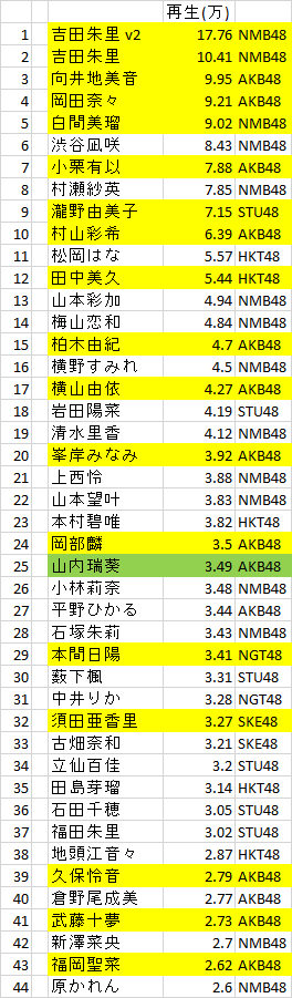 昨日の数字だけど再生回数順なら本店選抜との相関性が高い