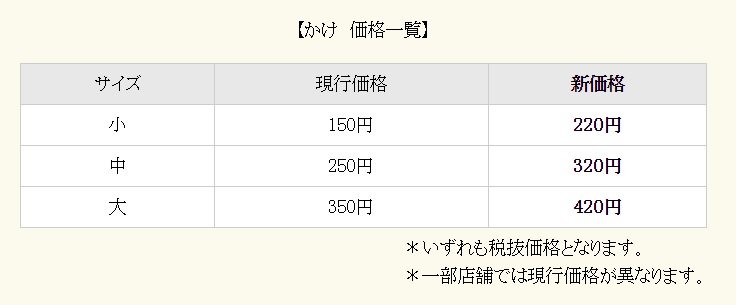 また、「かけ」(中)は250円から320円に、「かけ」(大)は350円から420円にそれぞれ値上げする。