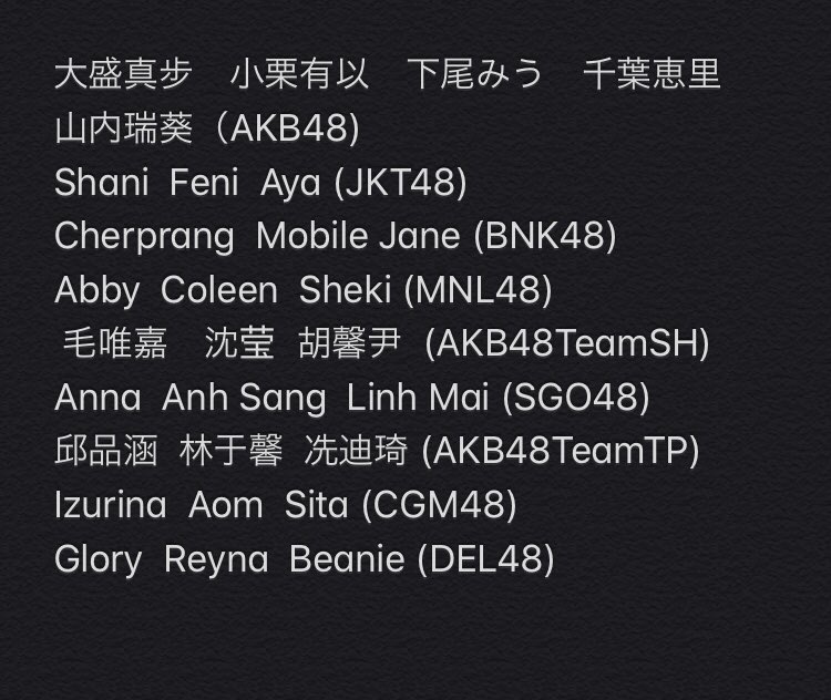 Abby、Coleen、Sheki (MNL48) /毛唯嘉、沈莹、胡馨尹 (AKB48 Team SH) / Anna、Anh Sang、Linh Mai (SGO48) / 邱品涵、林于馨、冼迪琦 (AKB48 Team TP) /