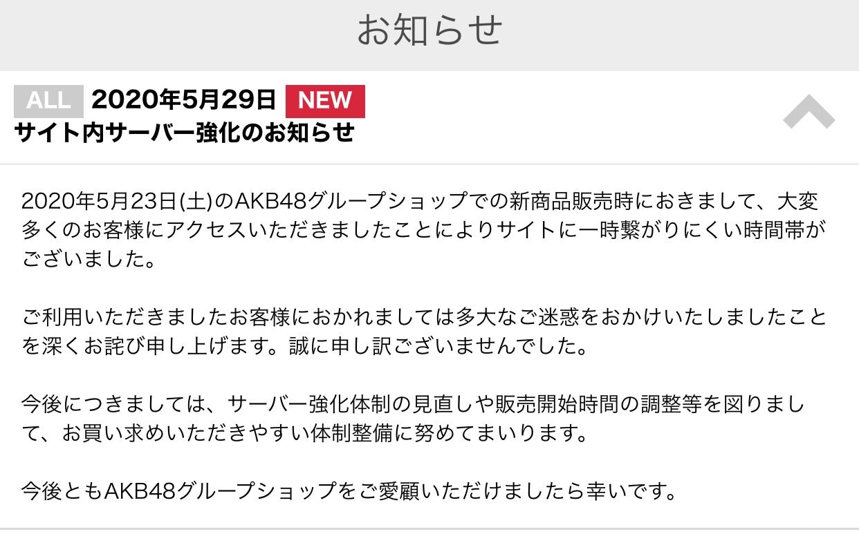 2020年5月23日(土)のAKB48グループショップでの新商品販売時におきまして、大変多くのお客様にアクセスいただきましたことによりサイトに一時繋がりにくい時間帯がございました。