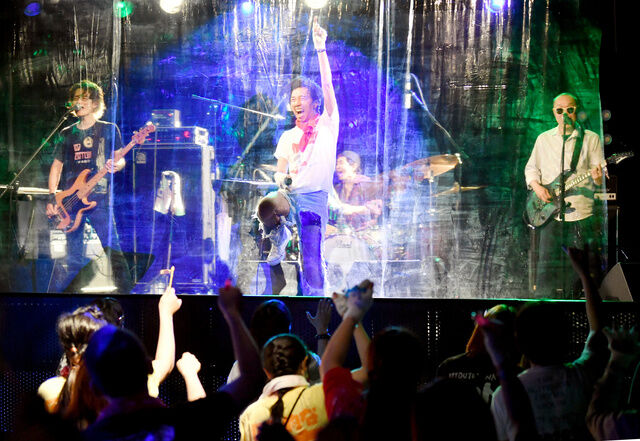 客席と舞台の間に透明なシートを張り、ライブをするバンド=2020年6月1日午後8時38分、大阪市中央区、金居達朗撮影
