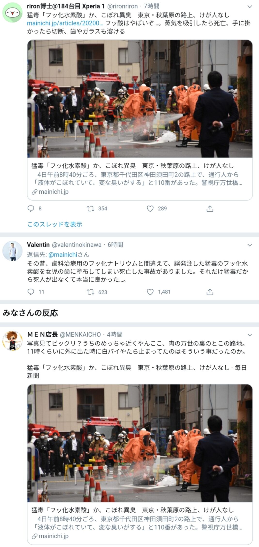 同署は周囲約100メートルを約2時間にわたって通行止めにし、防護服を着た東京消防庁の化学機動中隊員らが路面を除染するなどして処理した。けが人はなかった。