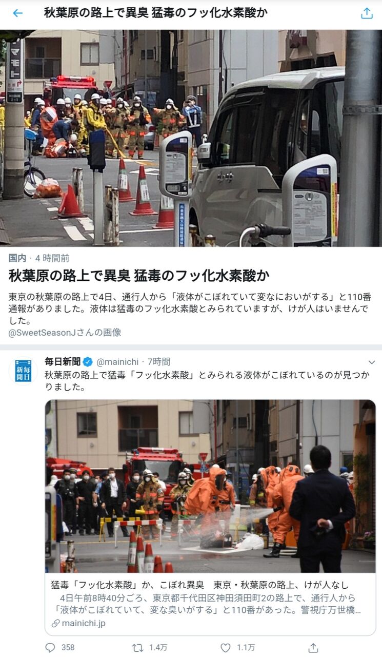 警視庁万世橋署員らが駆けつけたところ、500ミリリットルのプラスチック製容器が破損し、猛毒の「フッ化水素酸」とみられる液体がこぼれていた。