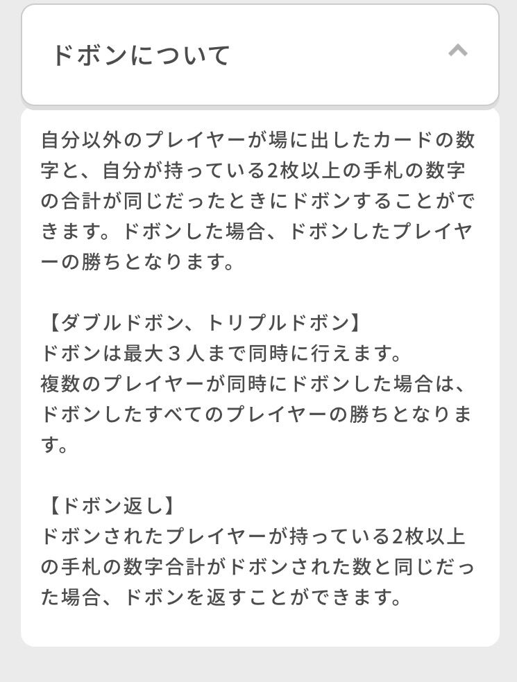 たとえば場にKが出されたとき、手札の合計値が13だったら「どぼん」であがり