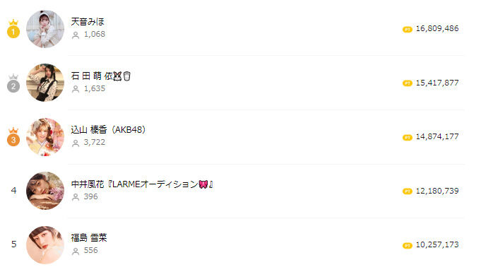 天音さんファンの貢献1位の人はトータル370万円投げたね