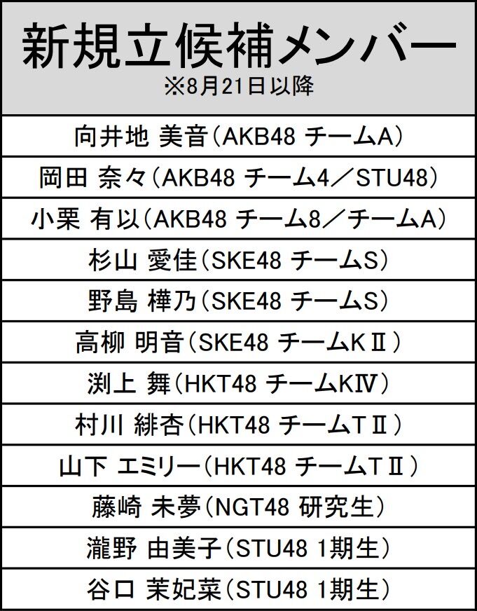 向井地美音、岡田奈々、小栗有以、山内瑞葵、高柳明音、渋谷凪咲、田中美久、瀧野由美子、石田千穂
