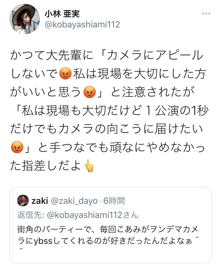 かつて大先輩に「カメラにアピールしないで��私は現場を大切にした方がいいと思う��」と注意されたが「私は現場も大切だけど1公演の1秒だけでもカメラの向こうに届けたい��」と手つなでも頑なにやめなかった指差しだよ��