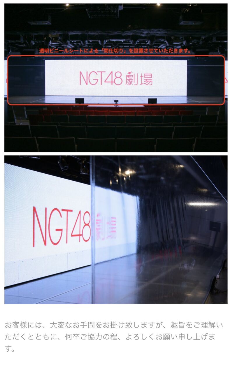 NGT48劇場は、政府より発信されております「新型コロナウイルス感染症に伴う<催物の開催制限等について>」に準じて、2020年10月11日(日)より感染予防対策を講じ、有観客の劇場公演を再開させていただきます。