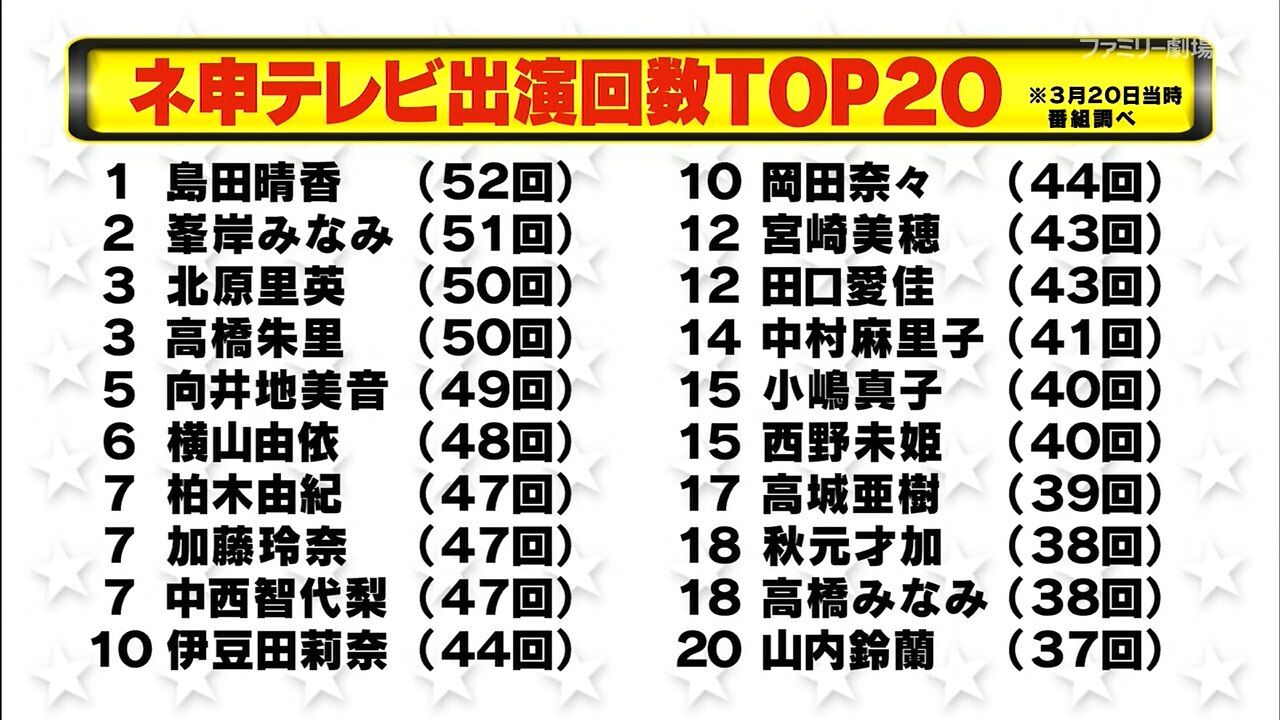 村仕事(ネ申テレビ)とはいえ、ネ申出演回数は現在52回で1位タイ。