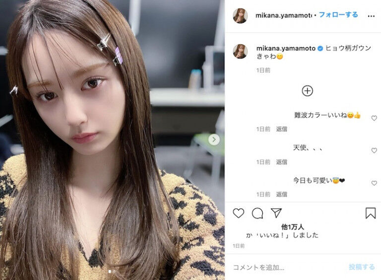 今回山本は「ヒョウ柄ガウンきゃわ」とコメントを添え、ヒョウ柄のガウンを羽織っての自撮りショットを公開。