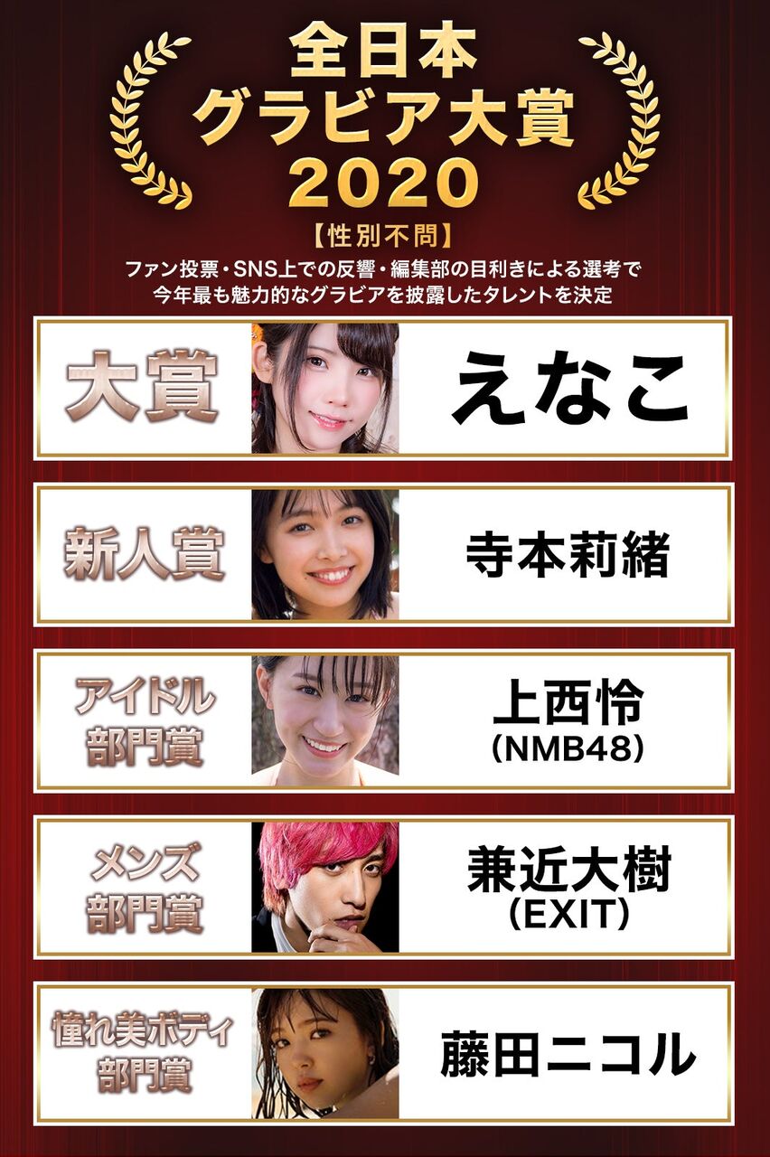 「全日本グラビア大賞2020」は、今年、紙媒体、WEB媒体、写真集、フォトブックなどにおいて、水着、ランジェリー、コスプレ、キャミソールなどの衣装でグラビア企画の出演またはリリースをした人物、