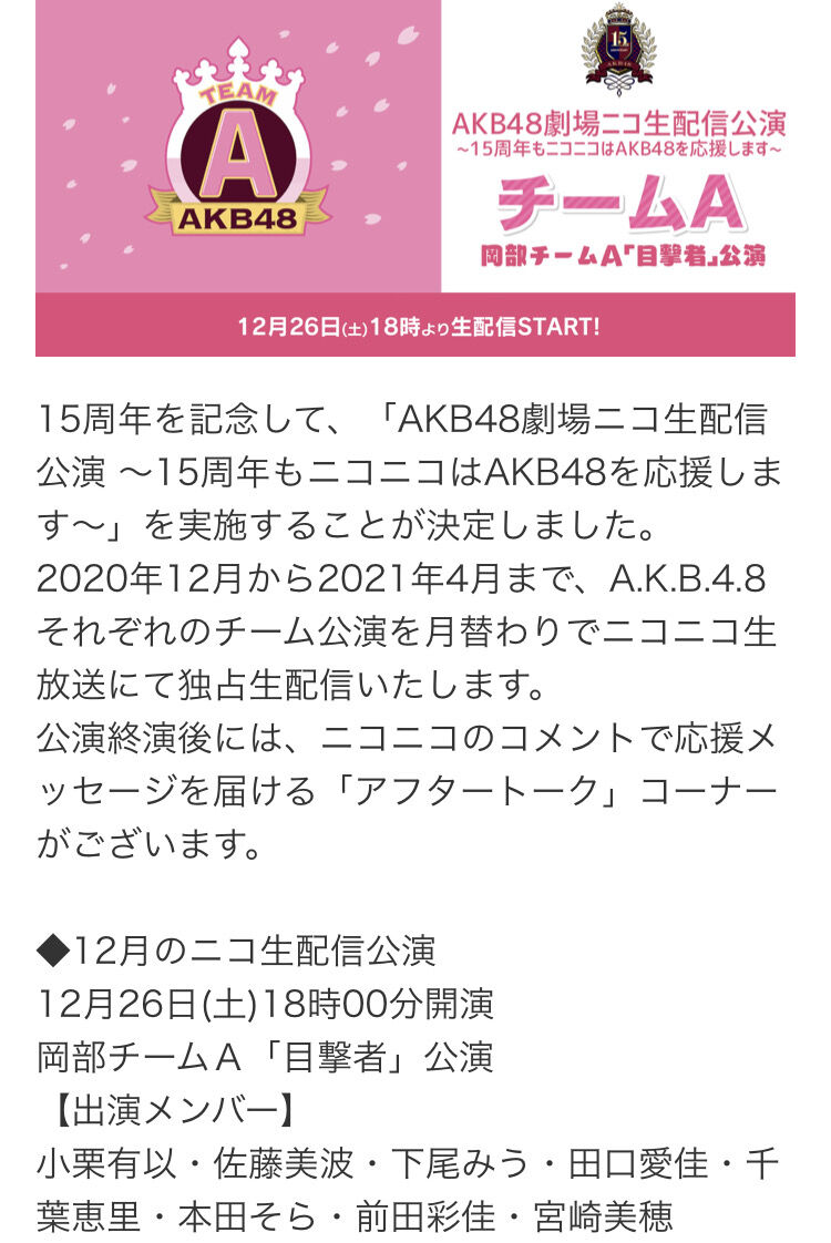 2020年12月から2021年4月まで、A.K.B.4.8それぞれのチーム公演を月替わりでニコニコ生放送にて独占生配信いたします。