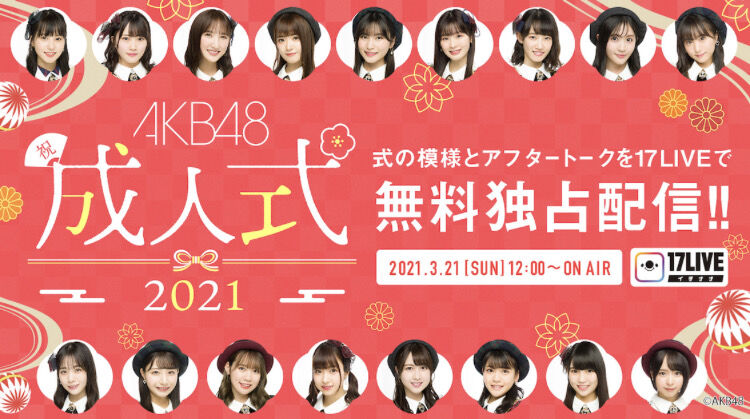 新型コロナウイルスの影響により延期しておりましたAKB48「2021年新成人メンバー成人式」の開催が決定し、その模様を3月21日(日)に「17LIVE」で無料配信いたします。