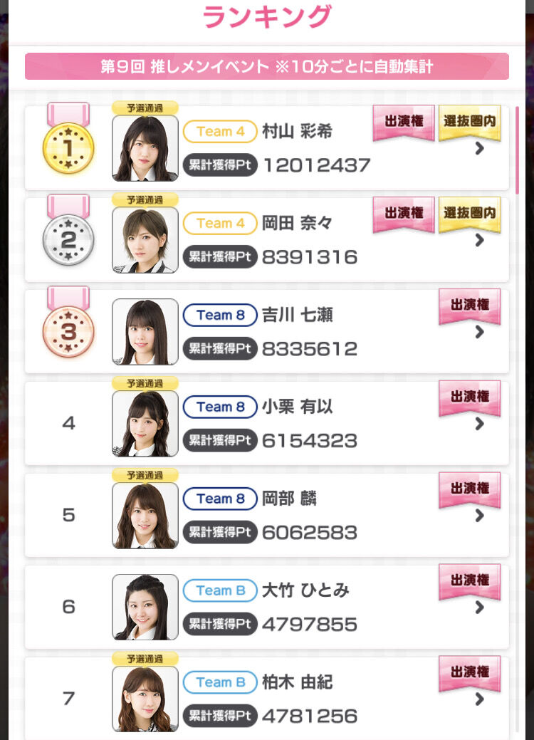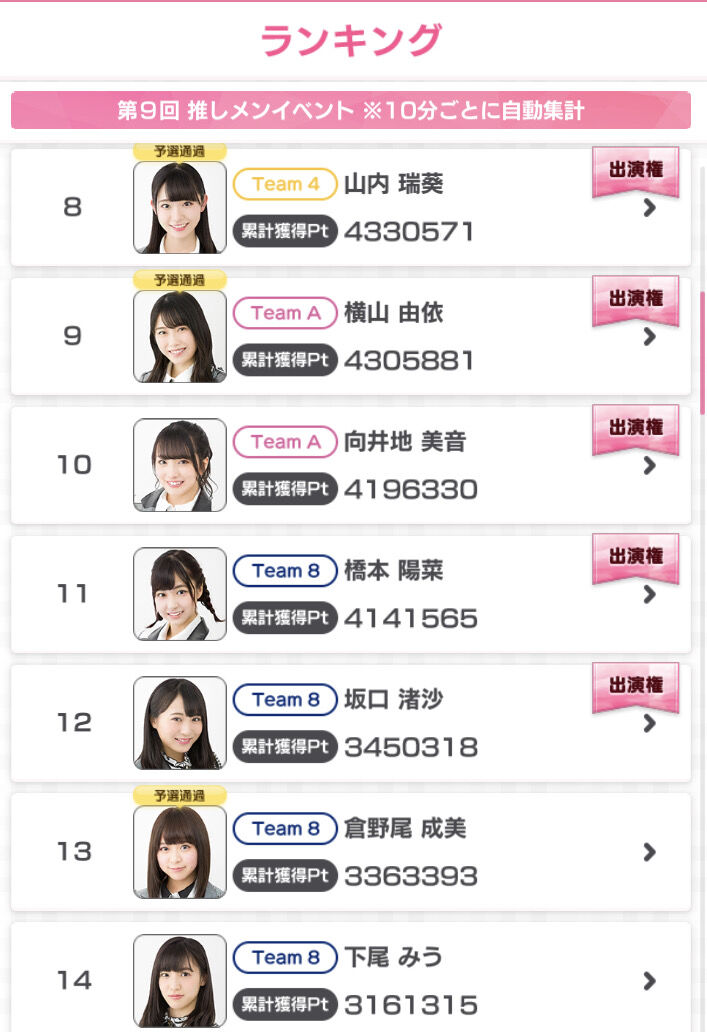 第9回推しメンイベントランキング上位12名+メンバーランキング上位2名+クラブ推しランキング上位2名にTV番組出演権をプレゼント